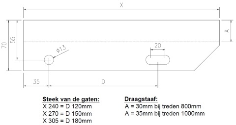 | Trede 800x305mm | 7,5 kg | 305mm | 180mm | 30x3mm | 30x30mm |